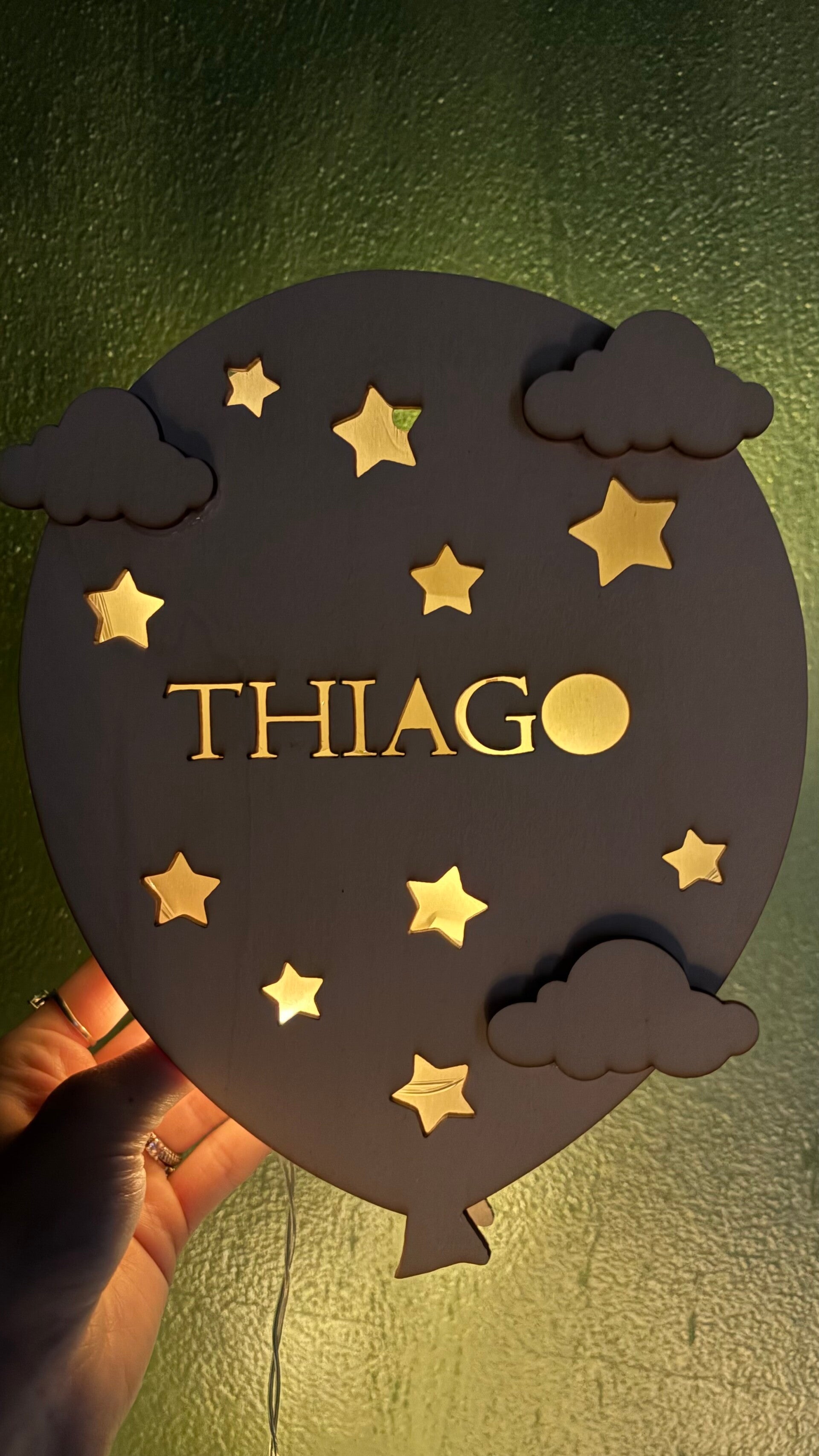 Lampada in legno a forma di palloncino con stelle, nuvole luminose e nome personalizzato.